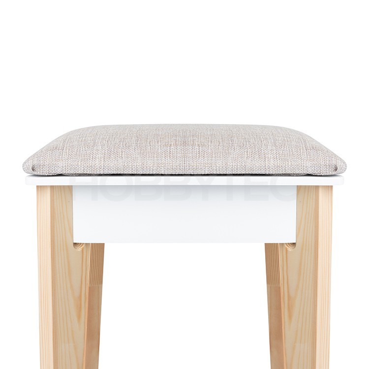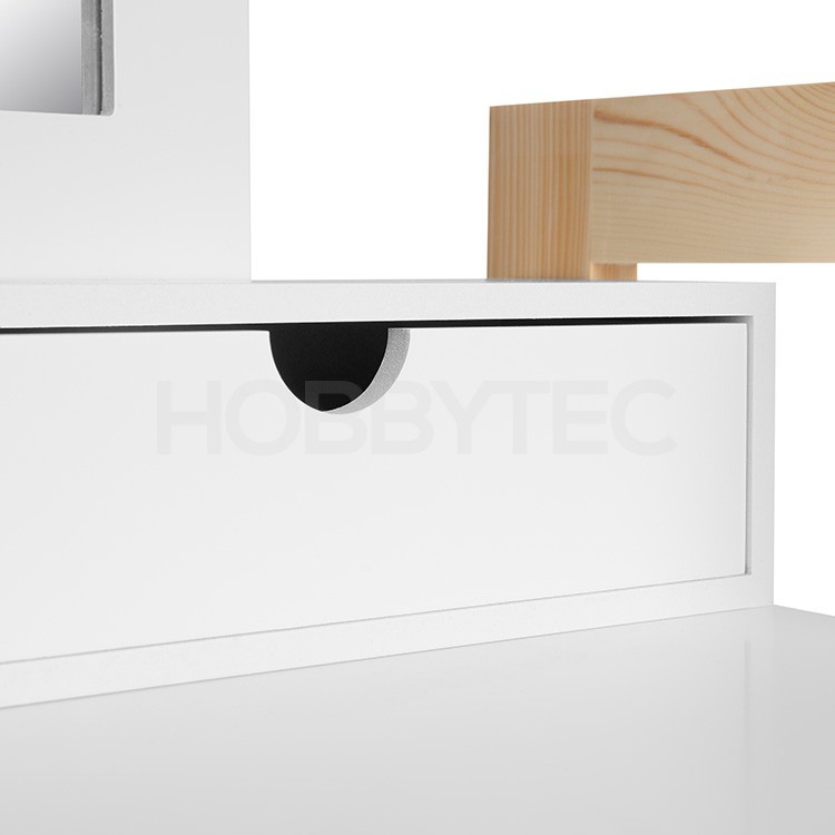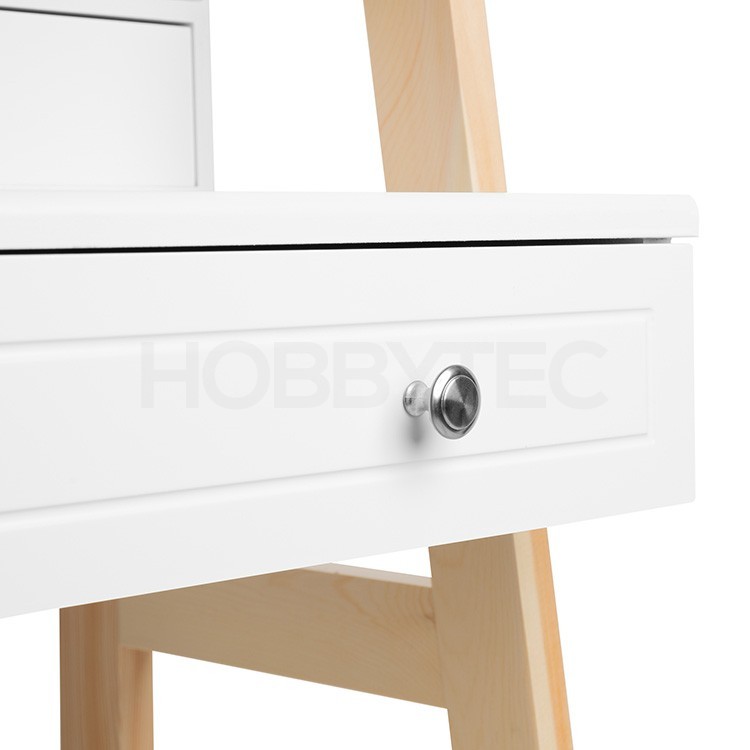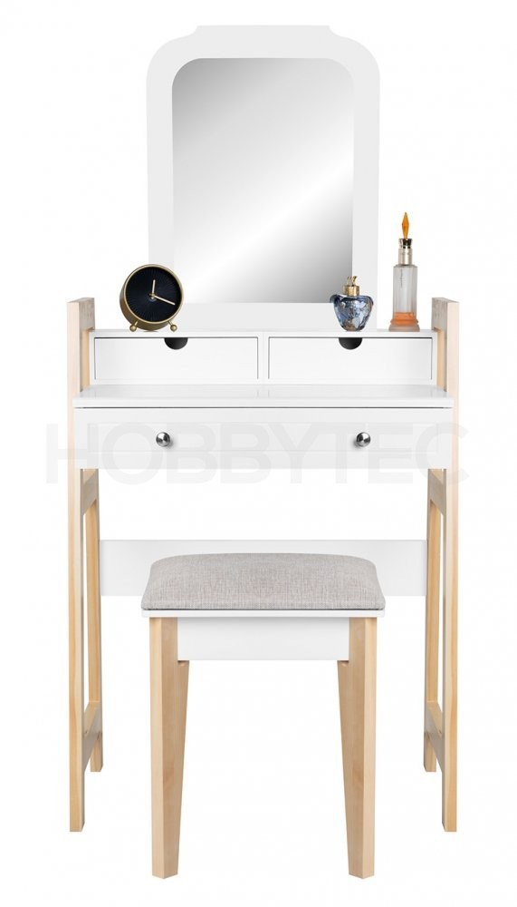 Součástí stolku je velké zrcadlo, tři zásuvky a čalouněná stolička pro pohodlné sezení.