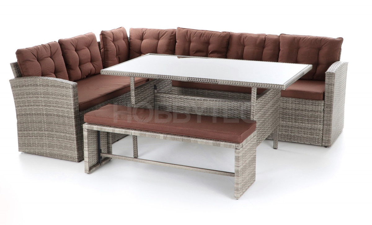 Luxusní rohová zahradní sestava s jídelním stolem určena k příjemnému posezení při relaxu s přáteli na terase či zimní zahradě.