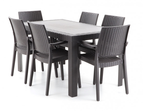 Stolová sestava se skládá z 6-ti pohodlných masivně vyztužených křesel v imitaci umělého ratanu s UV filtrem.