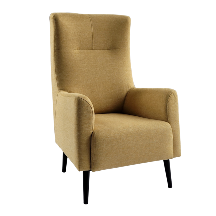 Je čalouněné potahovou látkou v pěti barevných variantách. Pohodlné posezení je zaručeno díky vysoké zádové opěrce. Křeslo má dřevěné nožičky.