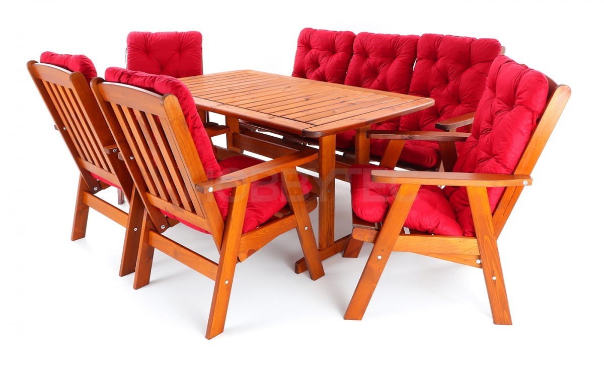 Luxusní masivní stolová sestava čtyř polohovacích křesel, jedné polohovací lavice a stolu z odolného a trvanlivého dřeva severské borovice. Odolné dřevo a velmi robustní konstrukce řadí tuto sestavu mezi nejmasivnější výrobky ve své kategorii na trhu.