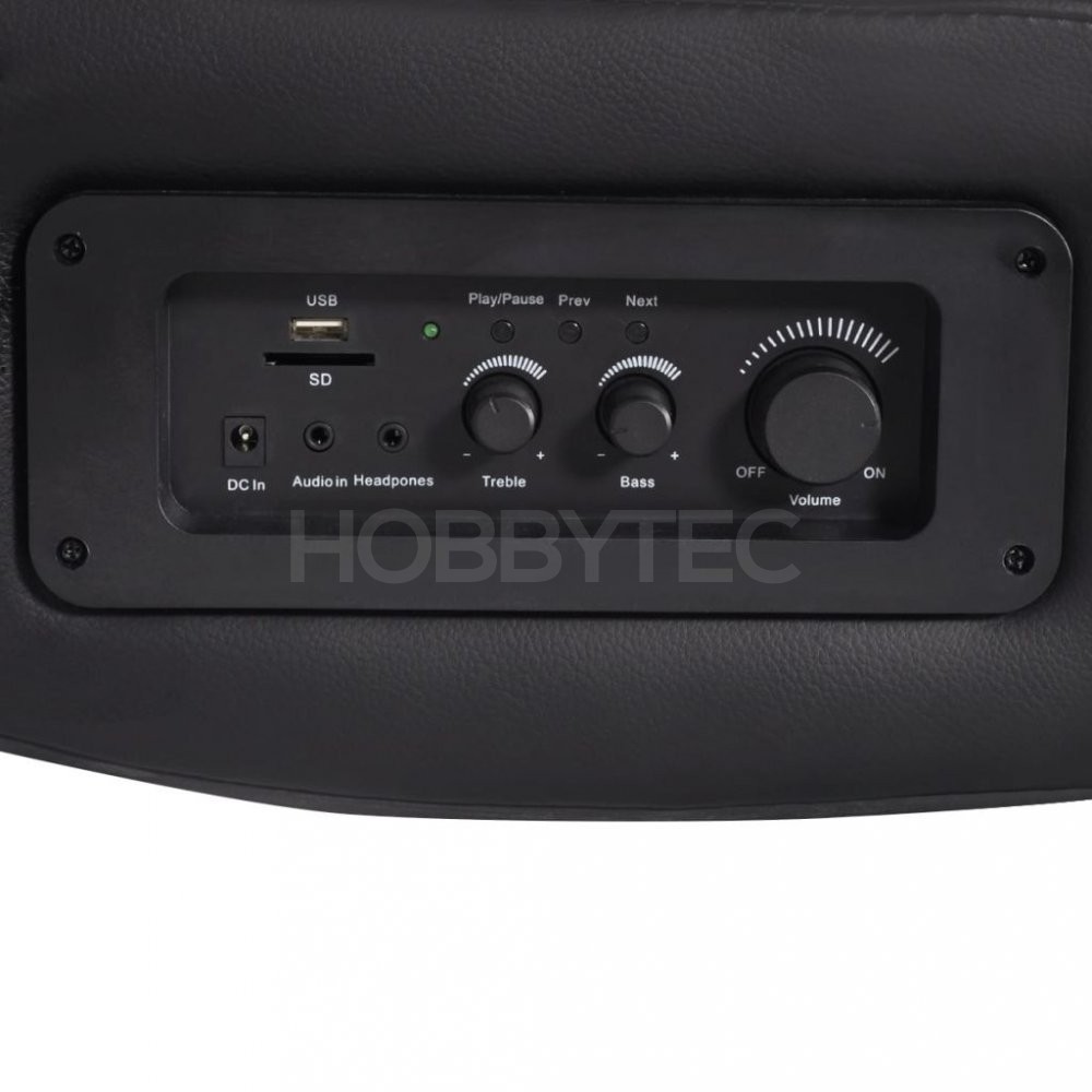 - Přehrává hudbu s pomocí 2/3D digitálních reproduktorů v ramenou a opěradle