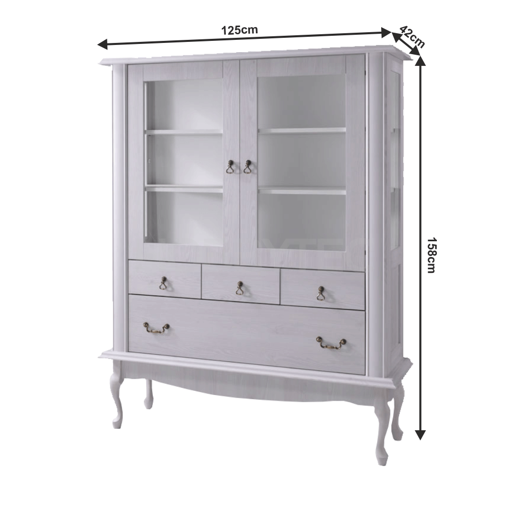 Vitrína VILAR DA5 nabízí úložný prostor v podobě čtyř šuplíků a polic. Stabilitu jí dodávají dřevěné nohy a disponuje kovovými úchyty.