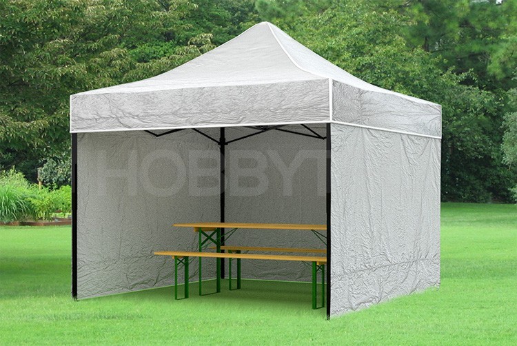 Zahradní či výstavní altán 2x2m ve francouzském stylu je nepromokavý a obsahuje 3 boční stěny. Rám je vyroben ze čtvercových ocelových profilů 30 mm opatřených kvalitní černou práškovou barvou. Spojovací prvky jsou vyrobeny z odolného tvrdého plastu.