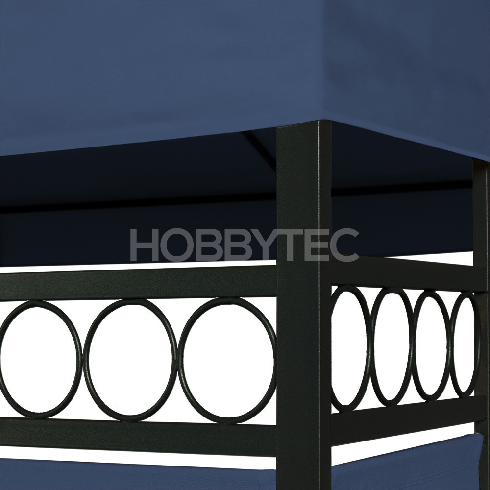 Pevná střecha je ukotvena na kovové konstrukci o 4 nohách. Větrání altánu přes střechu.