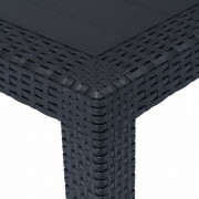 Zahradní jídelní sestava je vyrobena z masivního plastu, je tudíž pevná, odolná a nepodléhá nepříznivým vlivům počasí. Navíc se snadno čistí. Ratanový vzhled stolu oživí vaši zahradu přírodním kouzlem. Konstrukce všech částí této sady zahradního nábytku je lehká, takže je můžete bez námahy přesouvat z místa na místo.