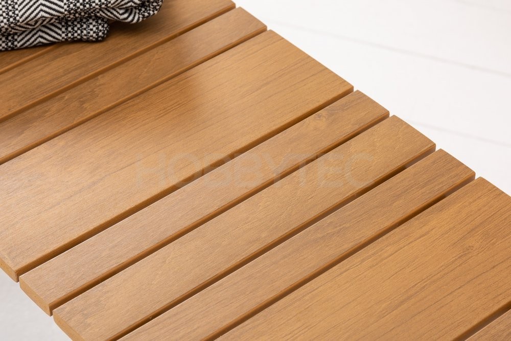 Materiál lavice je dokonale přizpůsoben venkovnímu použití. Hliník s práškovým nástřikem a prvky vyrobené z autentického polywoodu (dřevoplastu) bez problémů odolávají větru a počasí.