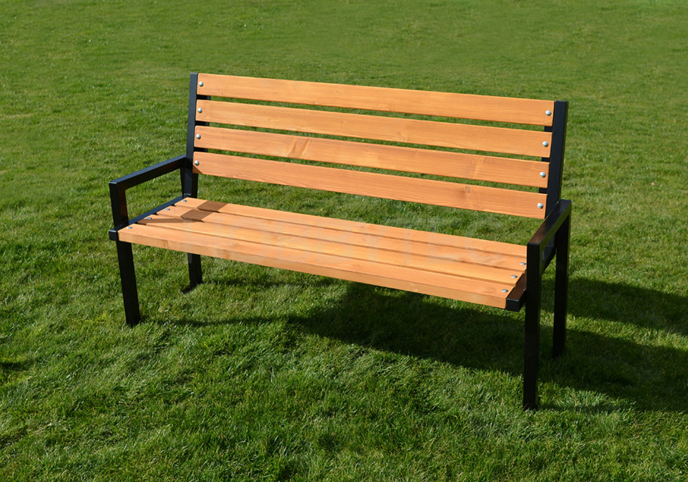 Lavička je vyrobena z borovicového dřeva a kovu.