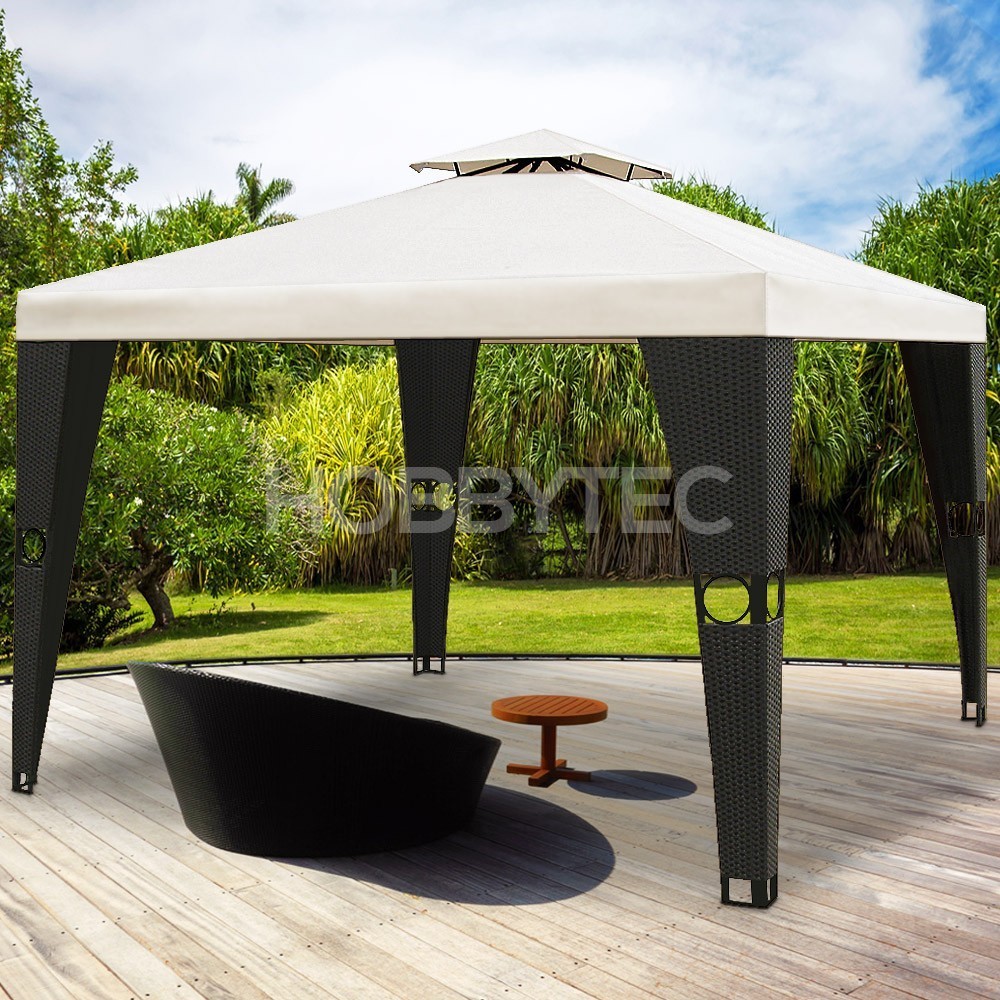 Elegantní polyratanový altán 3x3 m s exkluzivním designem poskytuje stín a vytváří příjemnou atmosféru nejen na oslavách, večírcích a jiných akcích. Střešní kryt zajišťuje dostatečné větrání a cirkulaci vzduchu v horkých dnech.