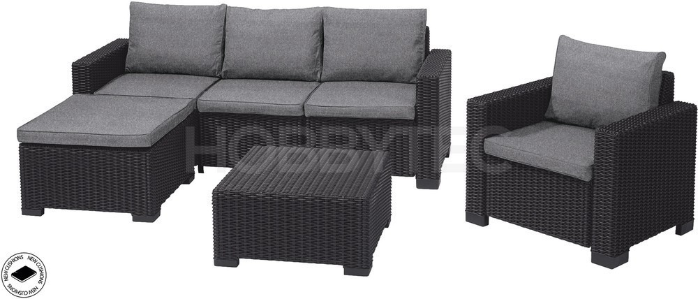 Kolekce nábytku se skládá ze široké, pohodlné trojité pohovky, jednoho křesla, univerzálního taburetu a čtvercového stolu.
