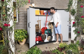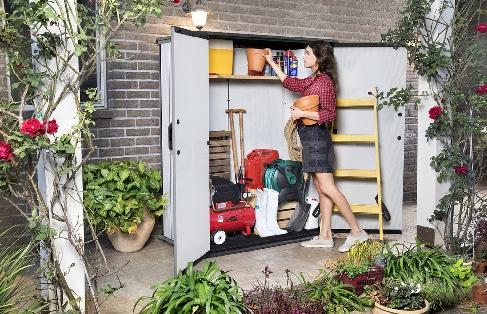 Prostorná zahradní skříň PREMIER HIGH STORE je dostatečně velká pro uložení mnoha nářadí a příslušenství, které jsou potřebné pro práci na zahradě. Bez problému do ní můžete uložit: barbecue gril, nábytek, podušky, konve, květináče a mnohé další předměty.