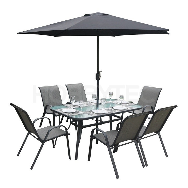 Je vyroben z kvalitního tvrzeného skla a černé oceli. Konstrukce je pevná a zajišťje stolu stabilitu. Uprostřed stolu je připravený otvor pro osazení slunečníku.