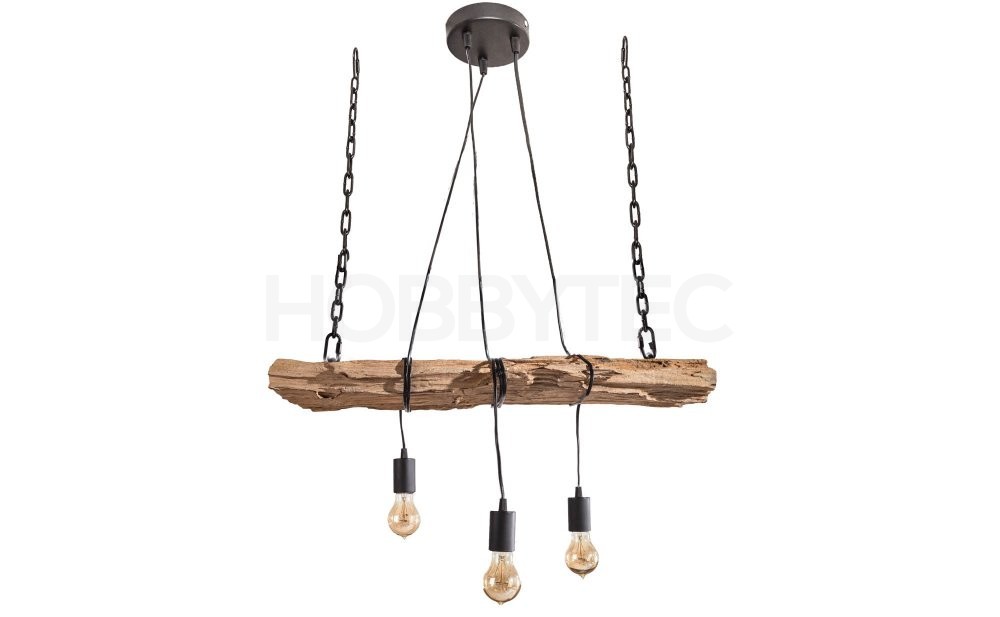 Tělo svítidla je vyrobeno z recyklovaného starého masivního trámu, který je zavěšený na výškově nastavitelných robustních černých řetězech. Celé svítidlo je laděno v industriálním venkovském stylu.